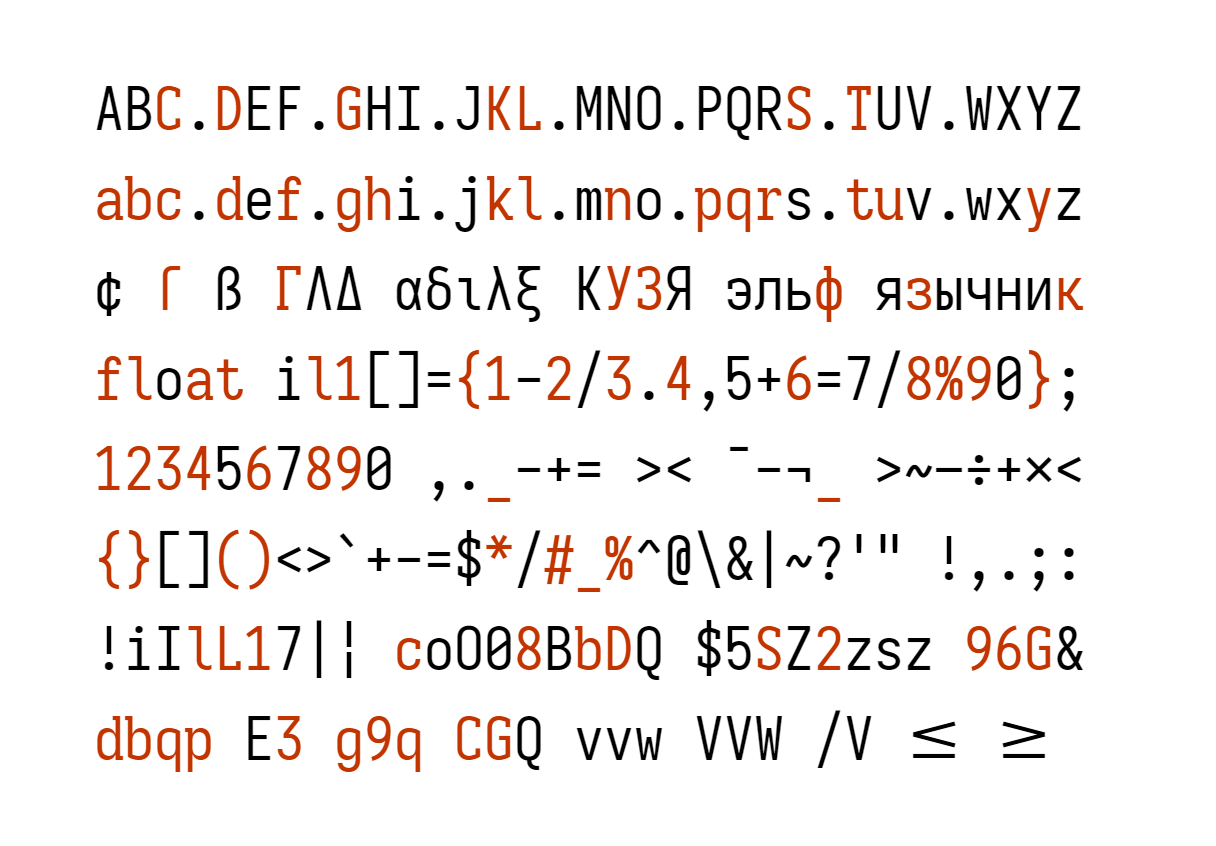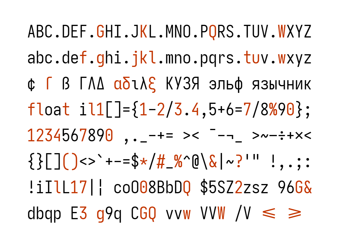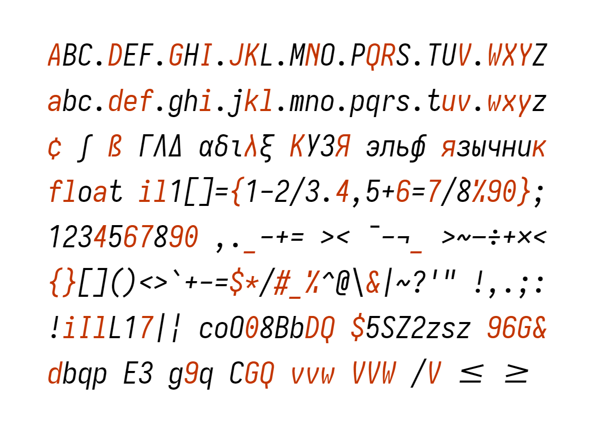 Alongside stylistic sets, Monospace Iosevka can also be configured to cherry-pick variants for each character using OpenType. The variants are shown below. To enable, assign the feature tag to the variant index. For example, setting cv26