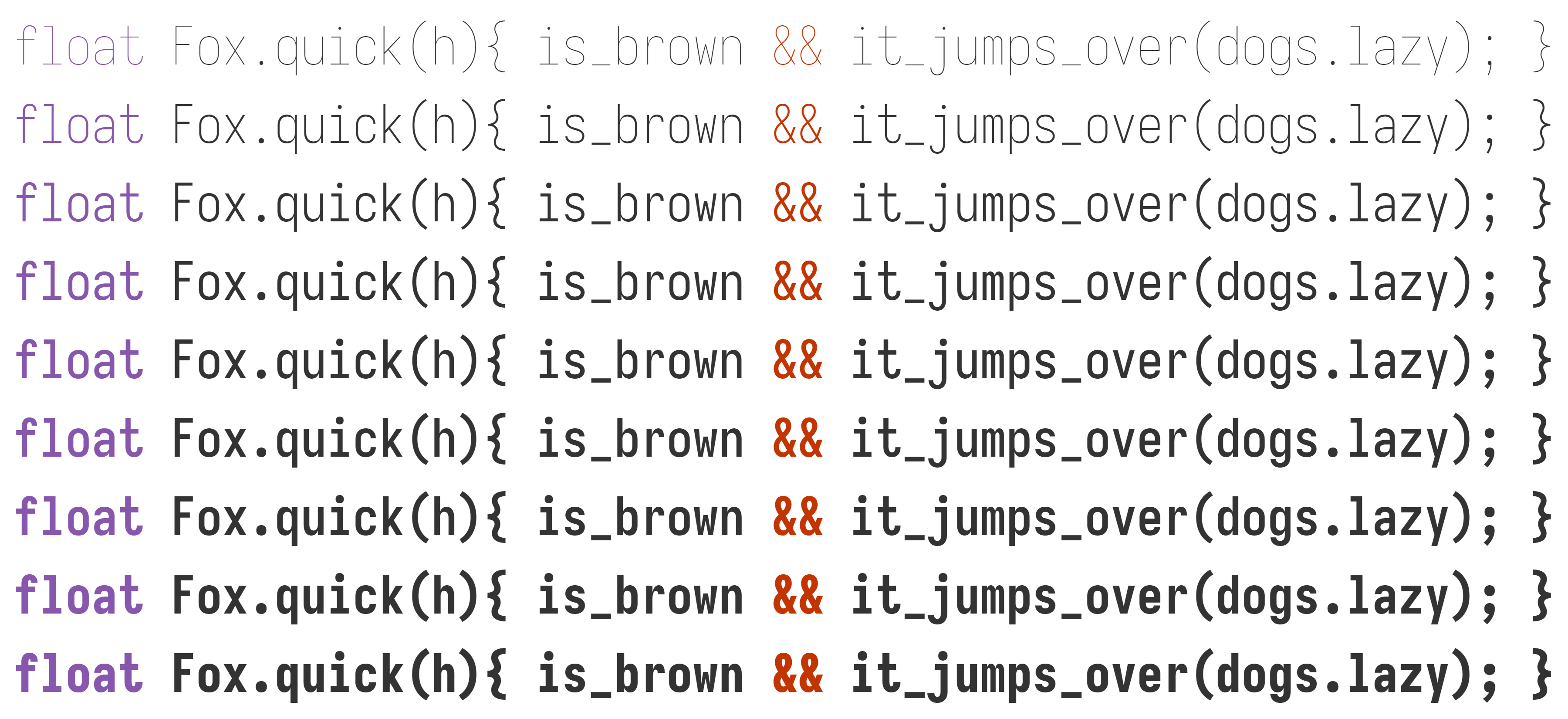 In the official package, Iosevka provides 6 monospace subfamilies (sans-serif and slab-serif, each in the 3 spacings Default, Term and Fixed) and 2 quasi-proportional subfamilies (Aile (sans-serif) and Etoile (slab-serif)). In all the monospace subfamilies, 9 weights (Thin to Heavy), 2 widths (Normal and Extended), and 3 slopes (Upright, Italic and Oblique) are included. In the quasi-proportional subfamilies, the quantity of widths is reduced to 1.